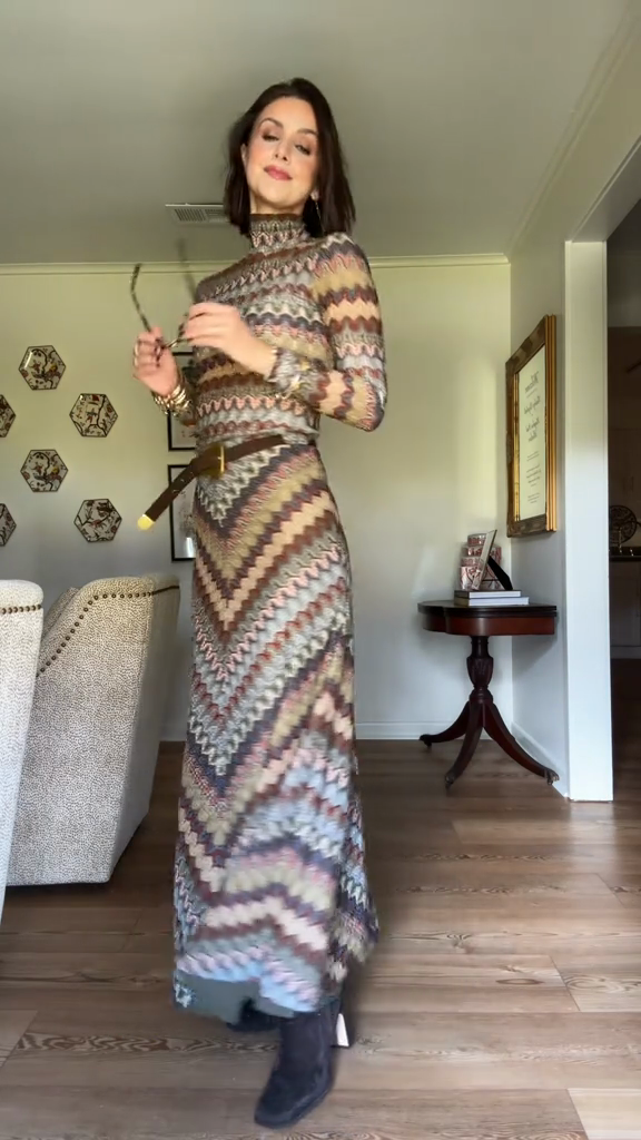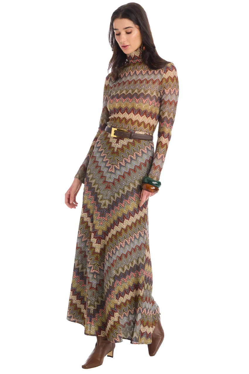 This is a long-sleeve maxi dress featuring a vintage-inspired chevron knit pattern (in earthy tones: olive, brown, pink, gray), styled with a wide leather belt at the waist. The design merges "retro 70s texture" (knit fabric, chevron print) with "modern polished styling" (cinched waist, turtleneck silhouette)—aligning with "elevated casual or bohemian-chic" trends, which prioritize textured, nostalgic pieces balanced by tailored details.
