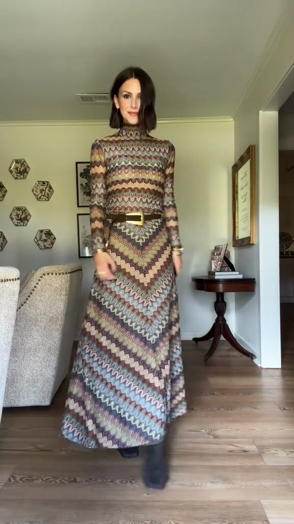 • Styling Highlights: Vintage Chevron Print, Turtleneck Neckline, Waist-Cinching Leather Belt, Flowy Maxi Skirt