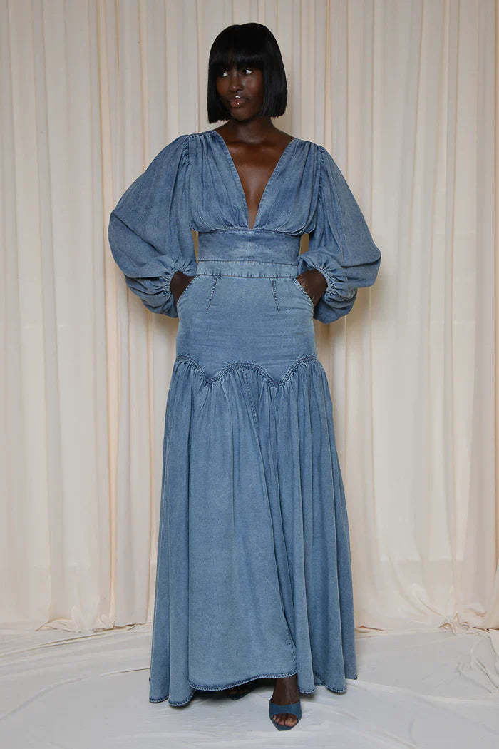 • Design: Light blue denim, deep V - neckline, puff sleeves, open - back with bow tie detail, maxi - length flowy skirt