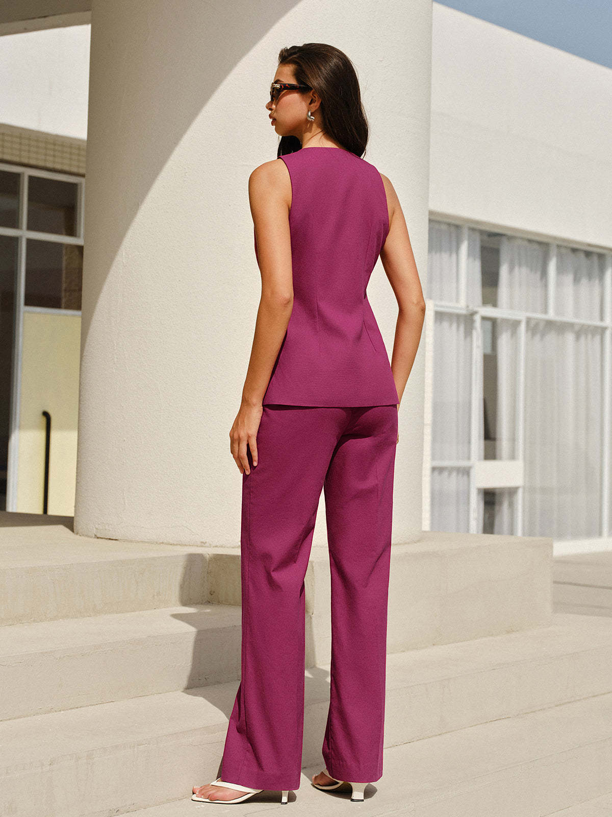 Sleeveless V-Neck Pants Set With Floral Buttons