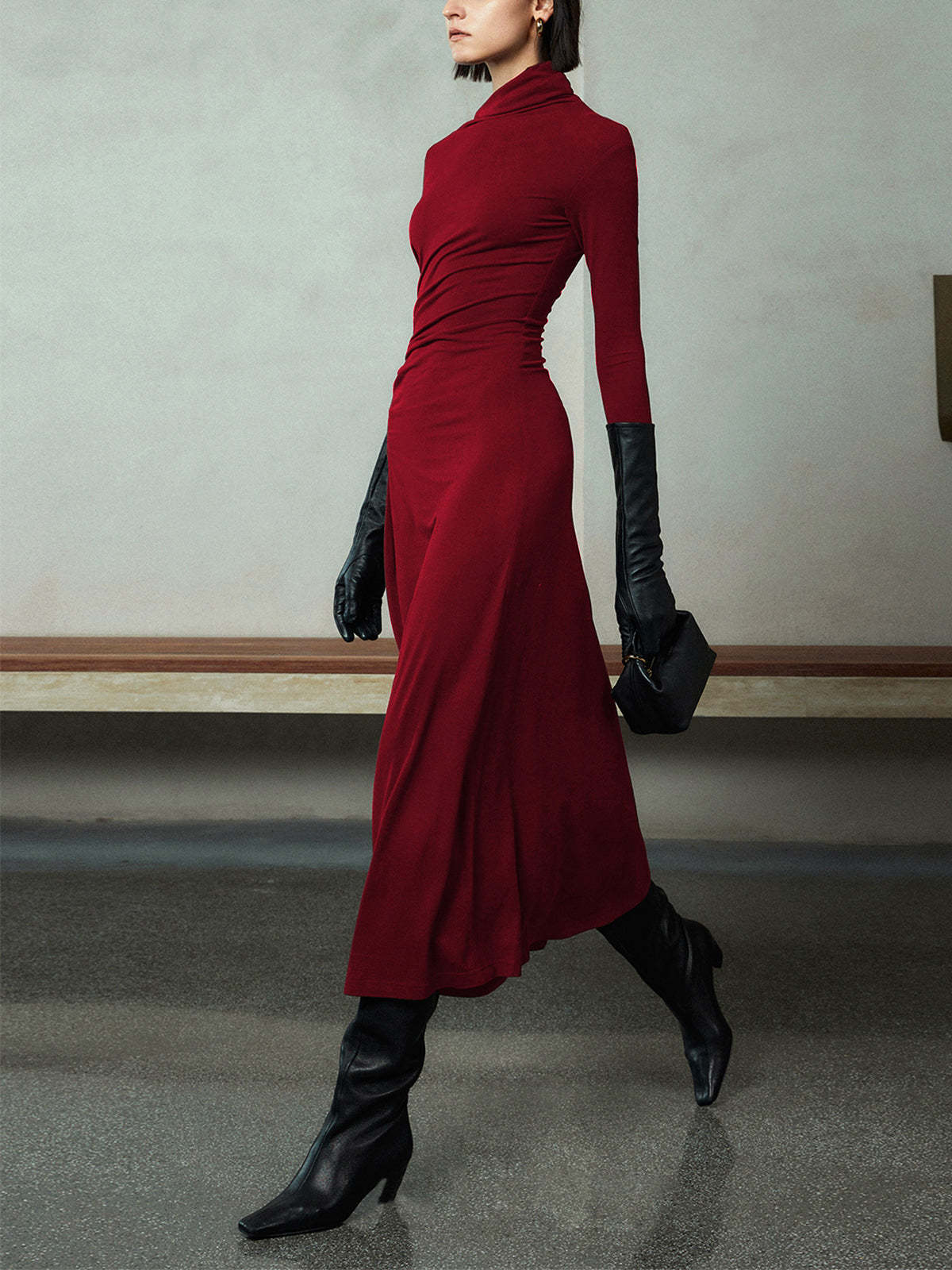 Bodycon Asymmetrical Neck Long Sleeve Ruched Maxi Dress