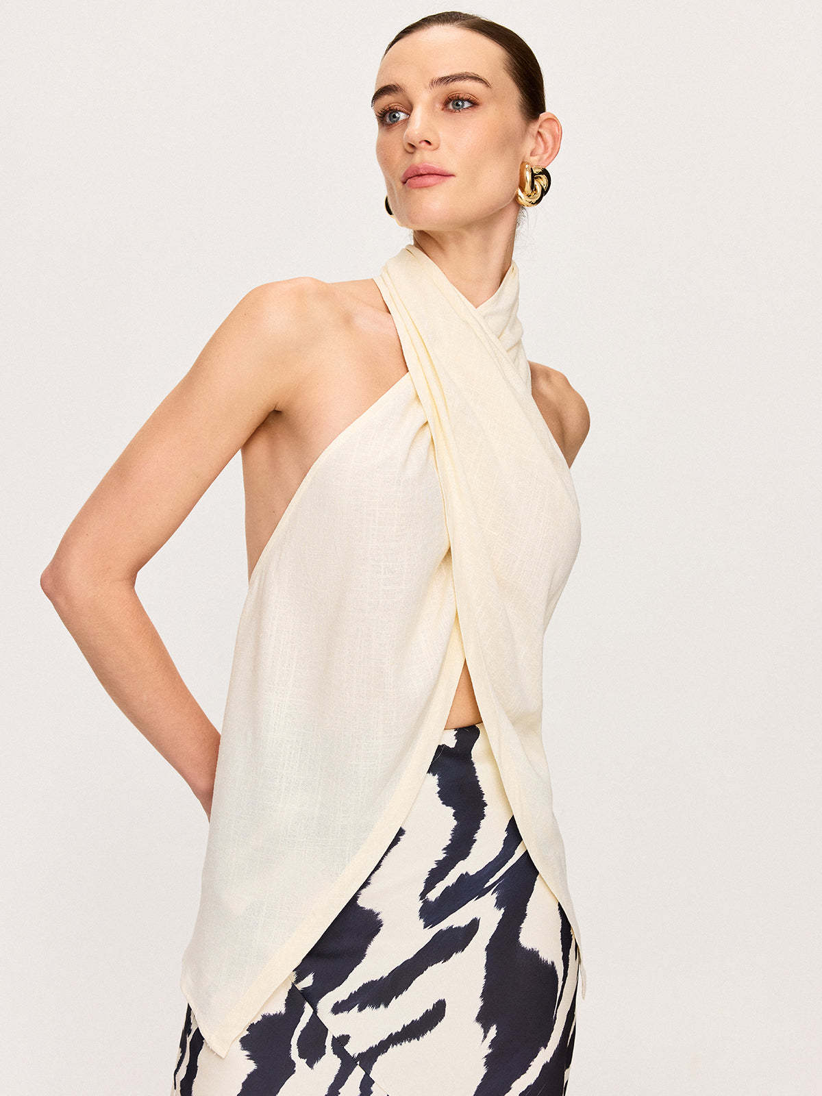 Semi-Sheer Cross-Halter Neck Wrap Top