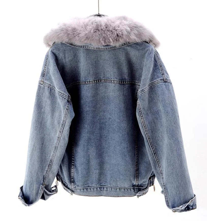 The durable denim fabric and the fur-lined lining provide comfortable warmth. The jacket's cut ensures freedom of movement, making it suitable for everyday wear.