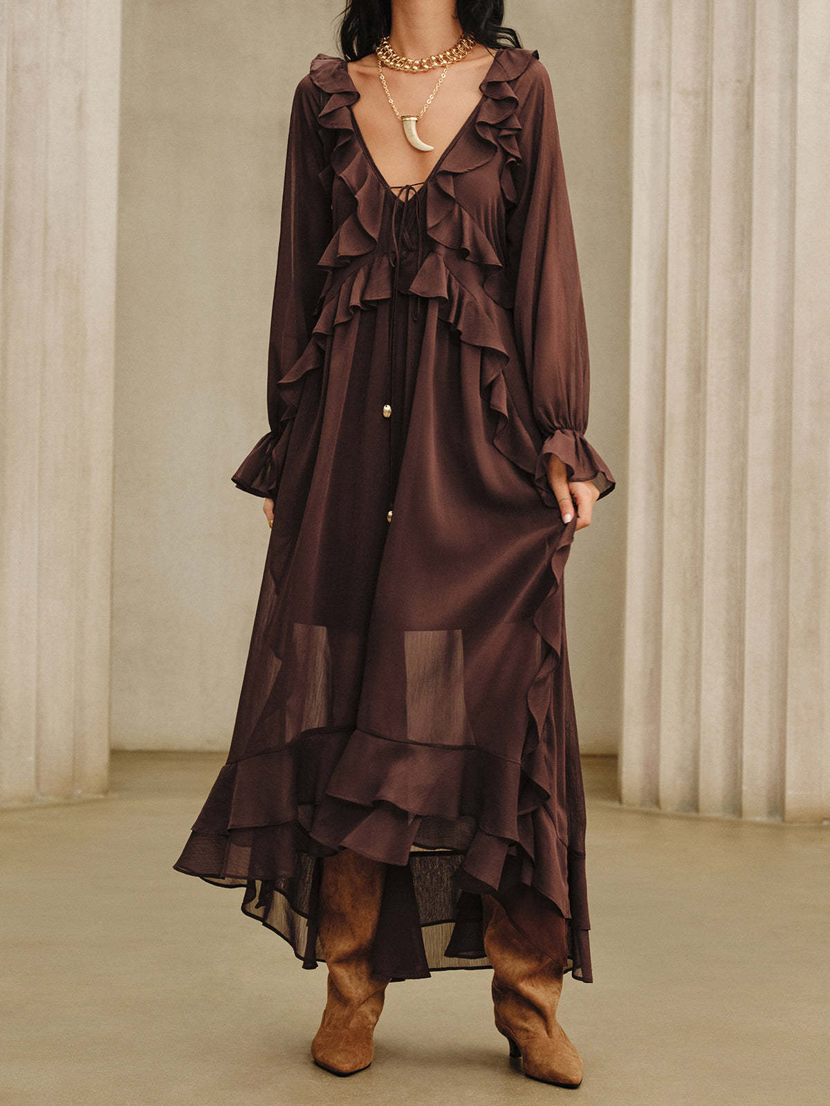 Ruffled Chiffon Maxi Dress Set with Cami Dress Liner